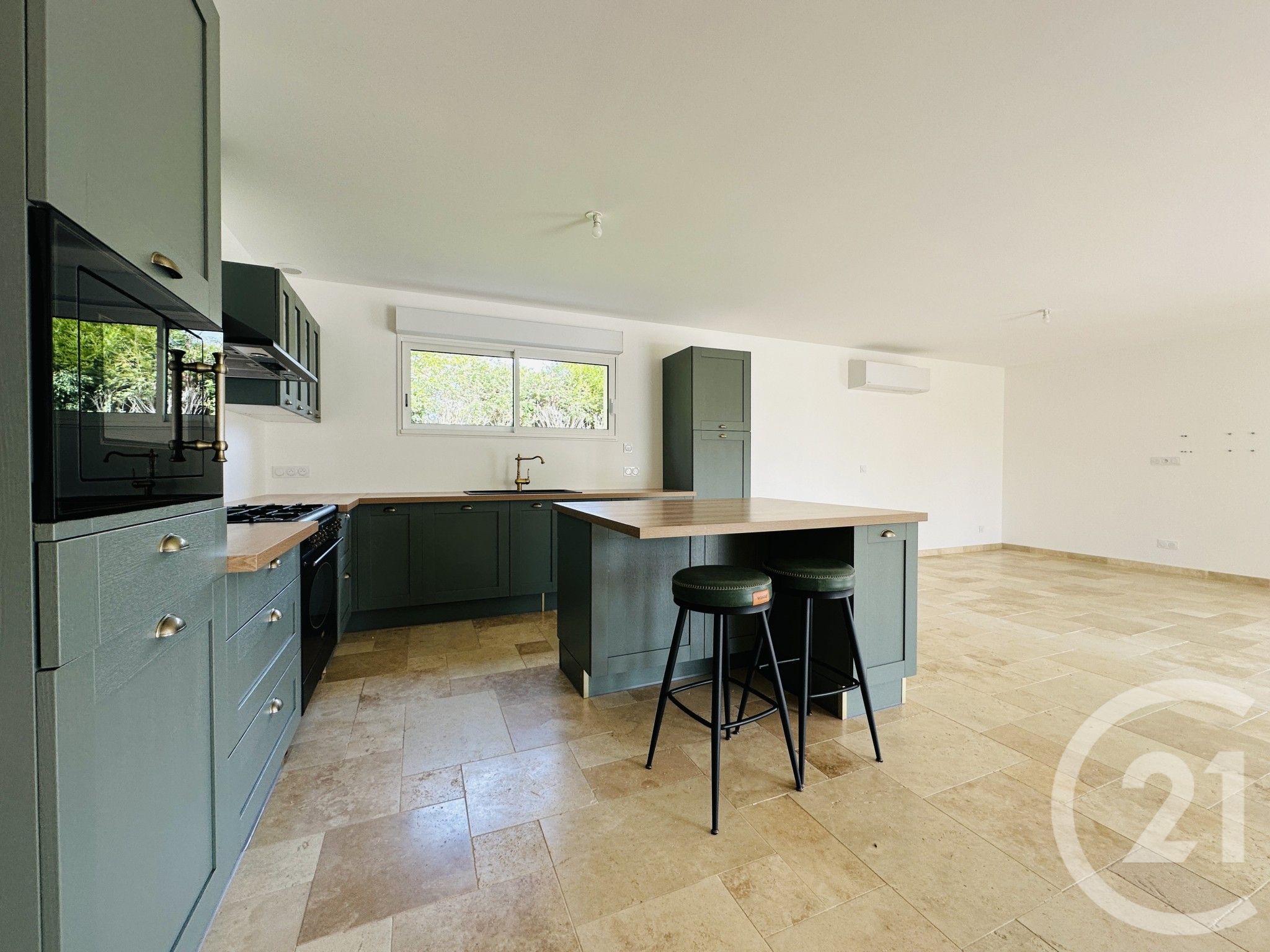 - Sol en travertin dans toutes les pièces.
